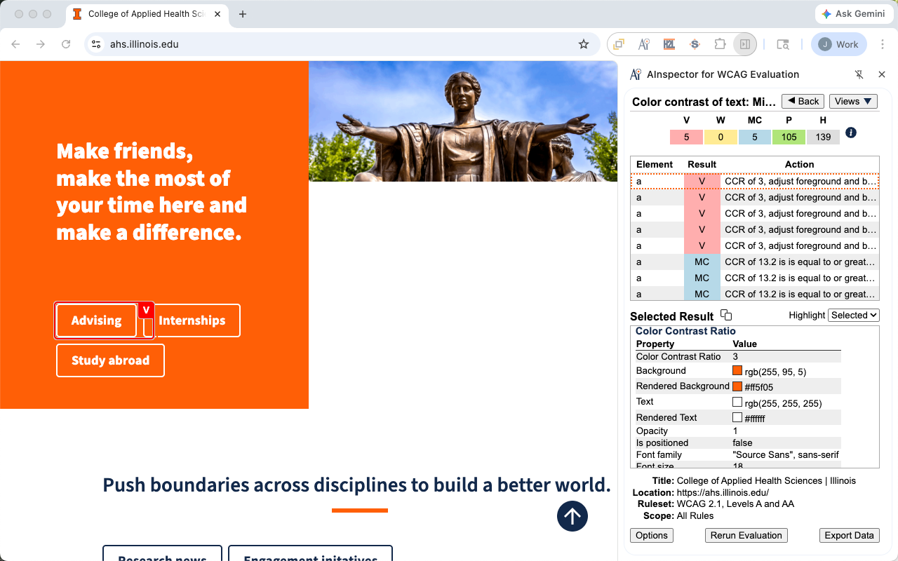AInspector screen shot of sidebar with element result information for color contrast